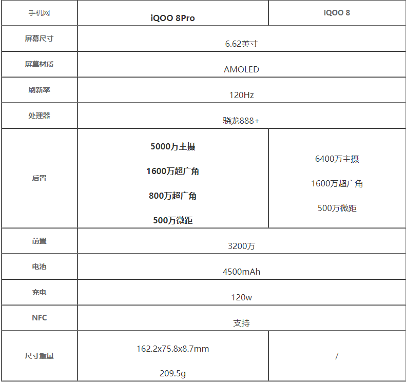 iqoo8和iqoo8pro的差别