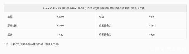 华为Mate30Pro的屏幕更换价格达到了1499元,而机身背部的后盖维修价格则是达到了450元,所以面对以上的这种情况,就需要大约两千元左右的维修价格了。也就是说,这样的价格其实还是相当昂贵的。因为华为Mate30Pro其实是一款价格5799元的手机,碎屏的维修费用几乎占据三分之一,成本还是很贵。