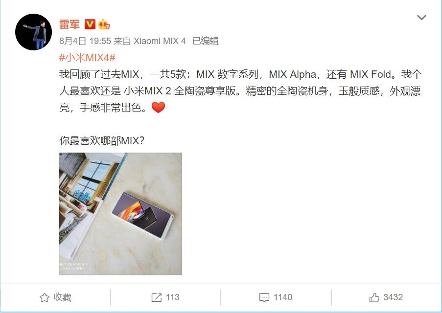 对于MIX 4,雷军表示绝不辜负大家期待。