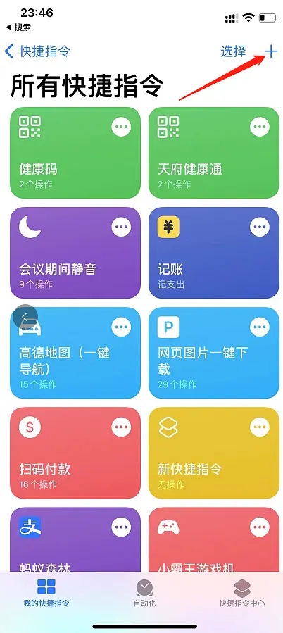 打开 “快捷指令”,点击 “+” 号新建,先添加操作 “URL”,内容就是上一步的 URL Scheme,然后添加操作 “打开 URL”,下一步输入名称 “健康码”,点击完成。