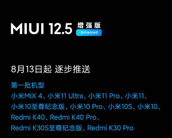 第一批机型包括小米MIX4、小米11 Ultra、小米11 Pro、小米11、小米10至尊纪念版、小米10 Pro、小米10S、小米10、RedmiK40、Redmi K40 Pro、Redmi K30S至尊纪念版、Redmi K30 Pro。