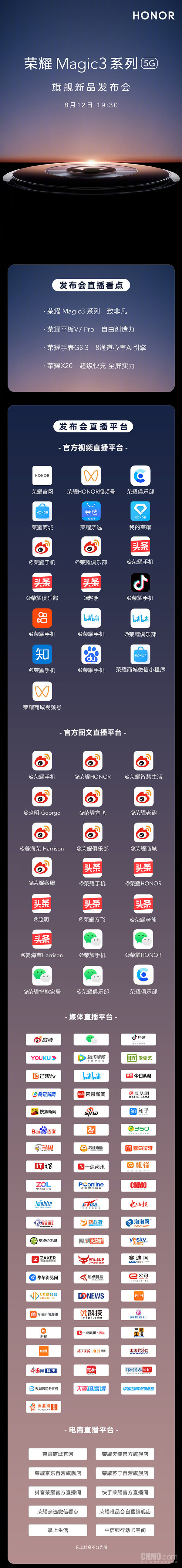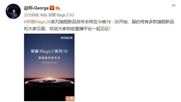 荣耀Magic3系列新品发布会将于今晚(8月12日)19:30正式举行,现在官方已经公布了发布会的直播平台。荣耀终端有限公司CEO赵明表示,届时将有多款旗舰新品和大家见面,欢迎大家一起见证!