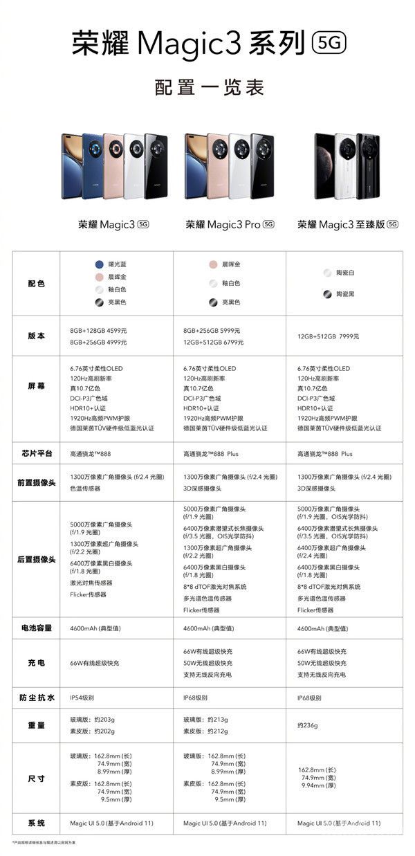 荣耀Magic3售价4599元起,Magic3 Pro售价5999元起,Magic3至臻版售价7999元。