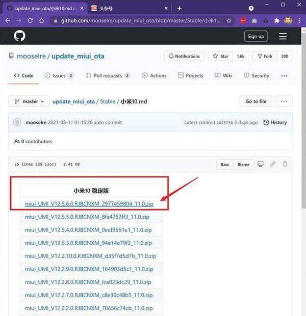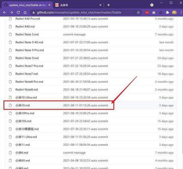 1. 用手机或者电脑打开这个网址:https://github.com/mooseIre/update_miui_ota/commits/master/Stable 如图 (其中mooseIre 那个是大写的i,不是小写的L)