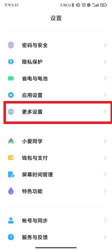 2、在设置界面中上划选项,然后点击设置界面中的【更多设置】,点击进入到更多设置界面;