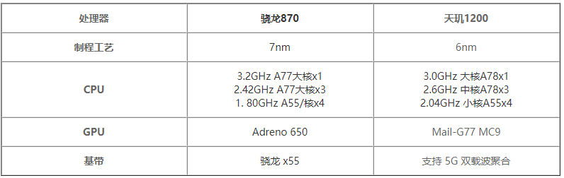 骁龙870搭载台积电的7nm制作工艺,带来很好的功耗性能体验;天玑1200搭载台积电的6nm制作工艺,是7nm的升级版本;