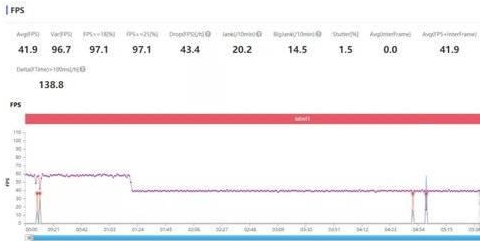 通过帧率监测可以看到,虽然一开始达到了60fps的平稳帧率,但仅仅坚持了1分钟之后,就被强制降频到了40fps,并一直维持在该帧率下运行,没有掉帧或卡顿,观察CPU占用,会发现整体核心运行都照旧比较平稳的,没有大起大落的现象。