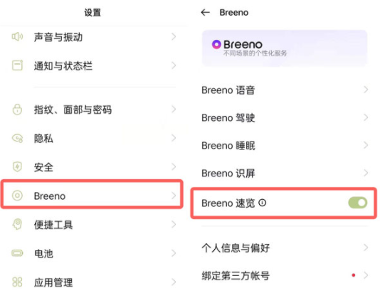 2、或者是可通过【设置】-【Breeno】-【Breeno速览】,打开手机负一屏;