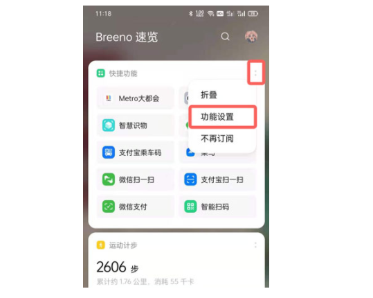 3、在进入负一屏之后,找到【快捷功能】,点击右侧的两个点选择【功能设置】;