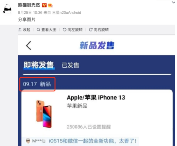 苹果将于9月14日发布 iPhone 13 系列,不过最近有数码博主分享了一张某电商平台的截图,而上面显示的日期为9月17日,如果这个日期是开售时间,那么 iPhone 13 系列基本确定是9月14日发布了。