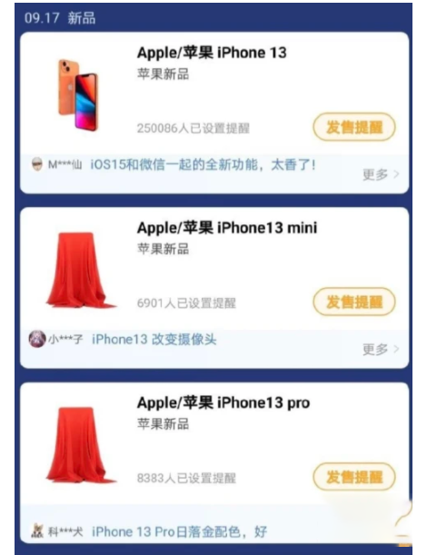 根据该图片显示,苹果即将发布的新品有 iPhone 13、iPhone 13 mini、iPhone 13 Pro、iPhone 13 Pro Max 以及9月30日发布的 AirPods 3 入耳式无线耳机。目前 iPhone 13 设置提醒的人最多。