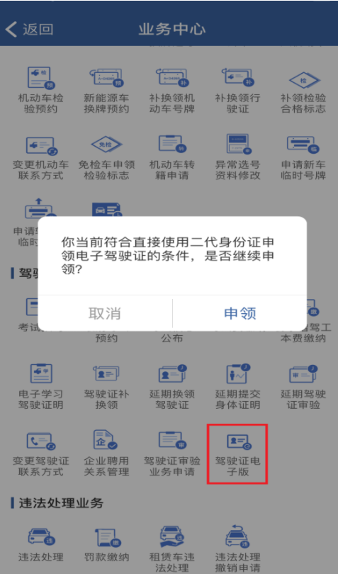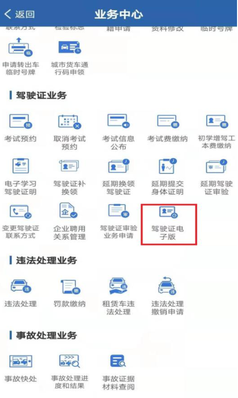 第二步:已注册用户请登录“交管12123”APP,可以在“交管12123”APP首页-【业务中心】或【我的驾驶证】模块中找到并进入【驾驶证电子版】模块;