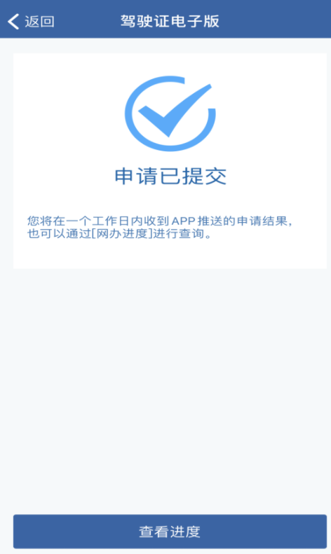 第三步:进入【驾驶证电子版】申领页面后,系统自动提示“您当前符合直接使用二代身份证申领电子驾驶证的条件,是否继续申领”,如您选择“申领”,则系统提示“申请已提交”,您将在一个工作日内收到APP推送的申请结果,也可以通过【网办进度】查询当前业务办理进度。
