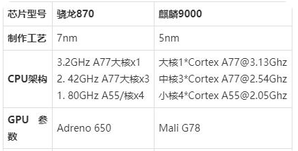 骁龙870采用最为稳定的7nm制作工艺,带来更好的手机性能体验,是目前最好的制作工艺之一,麒麟9000搭载最新的5nm制作工艺,为用户带来更好的手机功耗管理,为用户带来更好的手机性能体验。所以两者综合差不多。