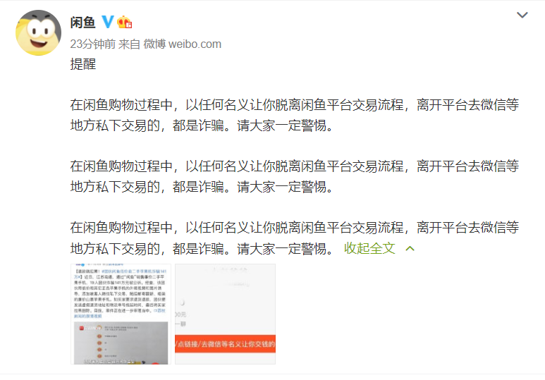 对此,闲鱼今日发表声明,千万不要离开平台,走微信等渠道交易,任何要求在第三方平台交易的卖家、买家,都是诈骗。