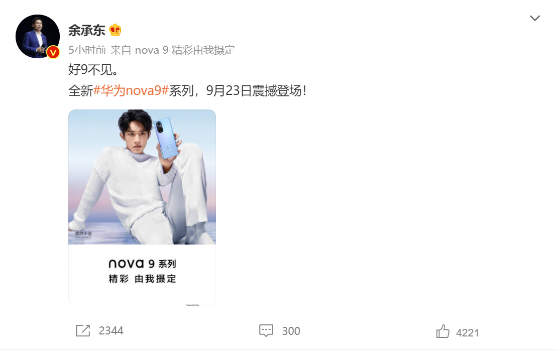 在用户们的期盼中,华为nova9系列终于确定了发布日期。9月6日,华为终端官方微博宣布,华为nova9系列将于9月23日登场。从本次的官宣透露的信息来看,华为nova9系列将有全新的外观色彩设计。