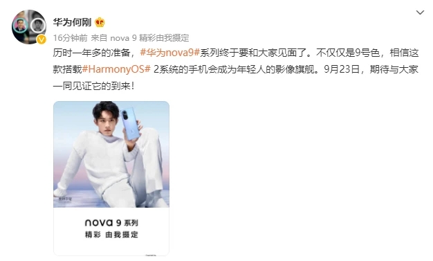 随后华为终端手机产品线总裁何刚在微博透露,华为nova9系列的研发历时一年多,不仅仅有全新的9号色,新品还将搭载HarmonyOS 2系统,将是一款属于年轻人的影像旗舰。