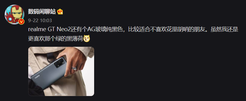 在发布会之前,数码博主 @数码闲聊站 放出了 realme GT Neo2 的 AG 玻璃纯黑色版本,没有“黑薄荷”那样的条纹,只是单纯的灰黑色设计。