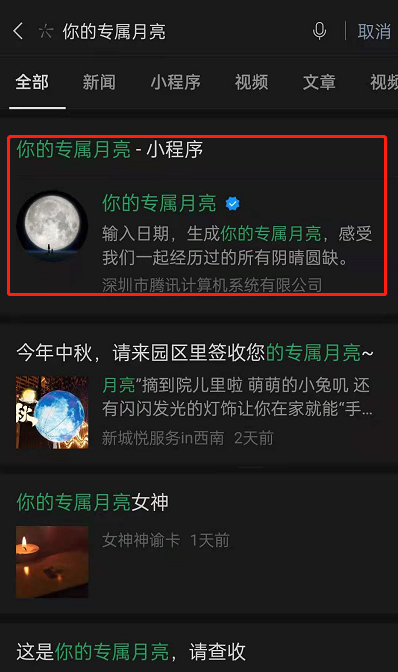 1、在微信中搜索【你的专属月亮】。