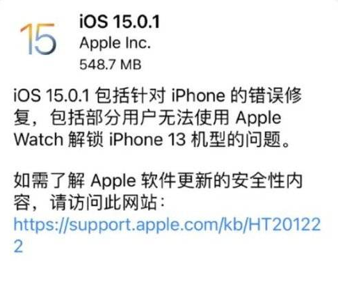 修复了部分用户使用Apple Watch无法解锁iPhone 13系列机型的问题。简单地讲这个iOS 15.0.1版本就是为iPhone 13系列用户而来的,至于其它iPhone机型估计在日常使用中应该感受不到变化。