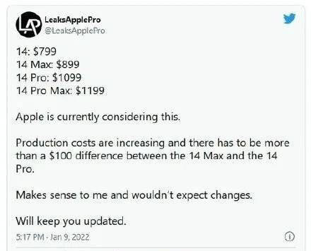 同时也有消息称,苹果希望提高iPhone14系列的售价。如果iPhone14采用全新设计方案的话,那么涨价就是确定的事情,毕竟新模具的开模成本需要用户来买单。日前,LeaksApplePro居然提前很久曝光了新机价格。爆料者强调,价格并非胡乱猜测,而是苹果内部正在慎重评估的内容。具体如下:iPhone 14起步价799美元,iPhone 14 Max起步价899美元、iPhone 14 Pro起步价1099美元,iPhone 14 Pro Max起步价1199美元。