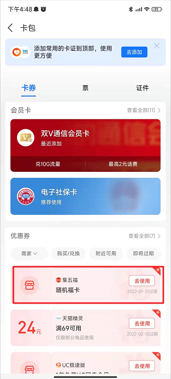 3、领取之后,在支付宝首页,点击“卡包”就可以查看到领取的随机福卡了。