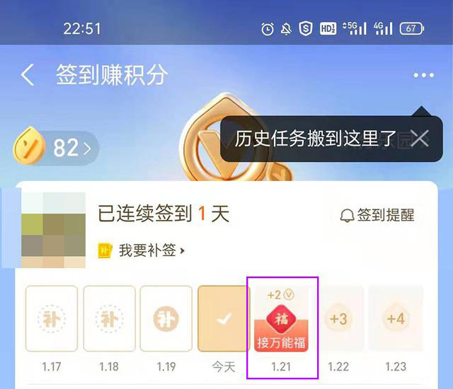 完成签到后,就可以看到次日的签到处显示【接万能福】,第二天再来签到就大概率可以获得万能福卡。