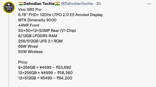 最后大家关注的价格方面,vivo X80 Pro就有些感人了,据外媒爆料vivo X80 Pro起步价为4599元,对于普通消费者来说,价格并不便宜。