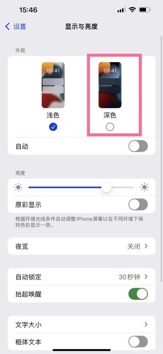也可以从屏幕刘海右边下滑打开控制中心,长按亮度条,选择深色模式,或者直接点击深色模式图标开启即可。