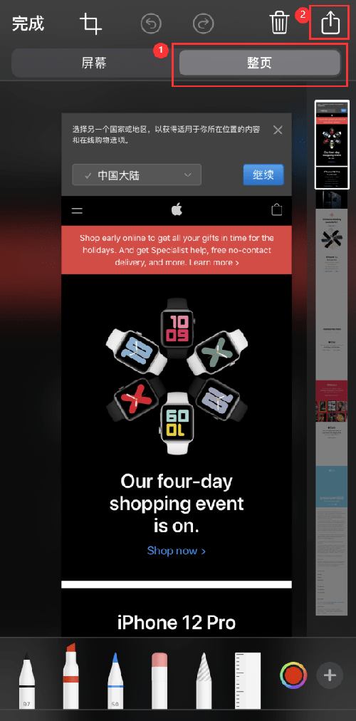 Safari 浏览器自带长截图功能,操作方法很简单,打开某个网站页面之后,可以按以上三种方式进行截图,然后轻点左下角的缩略图,在界面中选择“整页”,点击右上角的发送按钮,可以储存为 PDF 格式进行保存或分享给好友。