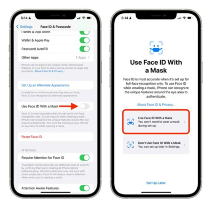 根据苹果的发布说明,iOS 15.4 添加了一个选项,可以在戴口罩时使用 Face ID,它的工作原理与普通的 Face ID 类似,但会扫描眼睛周围的区域以进行身份验证。用户还可以使用戴口罩的 Face ID 进行 Apple Pay 支付。(注:只有 iPhone 12 继后续机型才支持戴口罩解锁)