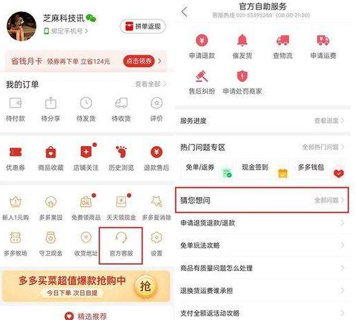 1、手机上打开拼多多,右下角点击“个人中心”,找到“官方客服”,新的界面点击“猜你想问”,如图: