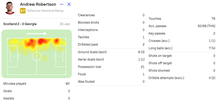 接下来是罗伯逊在苏格兰对格鲁吉亚的比赛表现。罗伯逊在本场比赛中发挥稳定,整场比赛全程出战并获评7.1分。在攻守两端均有出色表现,他共有4次过人(其中2次成功)和1次抢断。他共有79次触球,68次传球并成功传出2次关键传球,传球成功率为74%。65分钟时,罗伯逊在禁区内完成了一次抢断,随即在第56分钟时,中路队友完成了一脚远射。在第57分钟时,罗伯逊完成了一次人球分过的攻击,但在第67分钟时,他却在禁区内从身后放倒了对方球员,遭到一张黄牌警告。罗伯逊本场比赛是第64次为苏格兰出场。