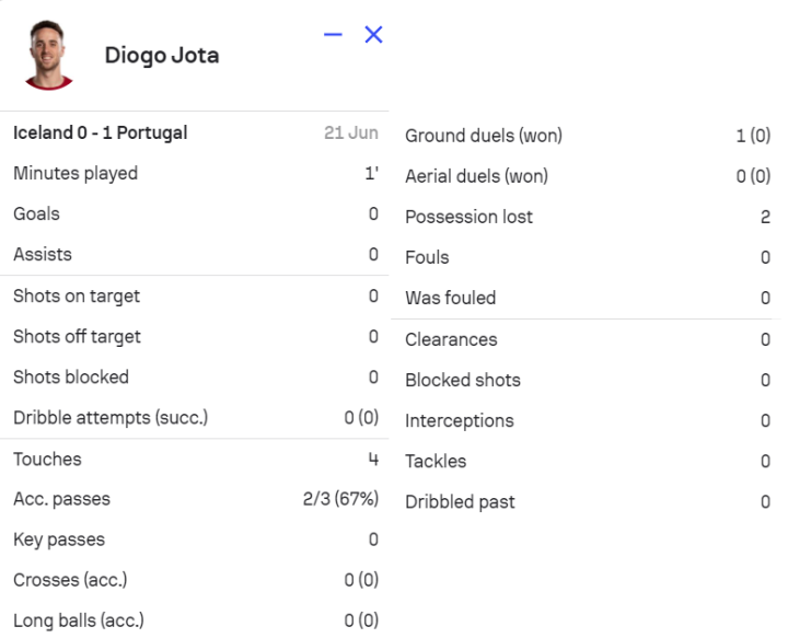 若塔则在冰岛对阵葡萄牙的比赛中替补出场。若塔在第90分钟时被换上场,进行了4次触球和3次传球,传球成功率为67%。这是若塔第32次为葡萄牙出场,虽然替补出场时间不长,但是未来的机会必将有很多。