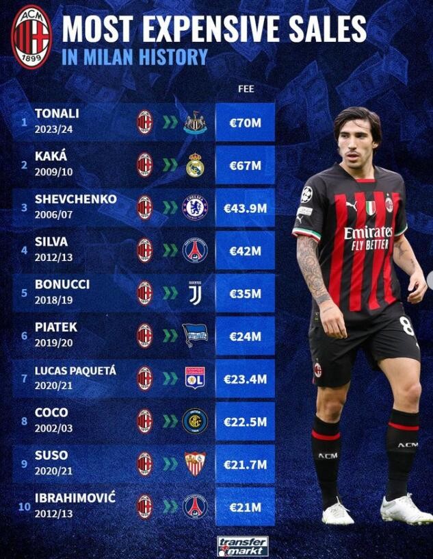 据消息报道,北京时间今晚,托纳利正式加盟英超球队纽卡斯尔联。这笔转会的费用高达7000万欧元,让他超过了之前的队内名宿卡卡和舍甫琴科,排名队史第一。