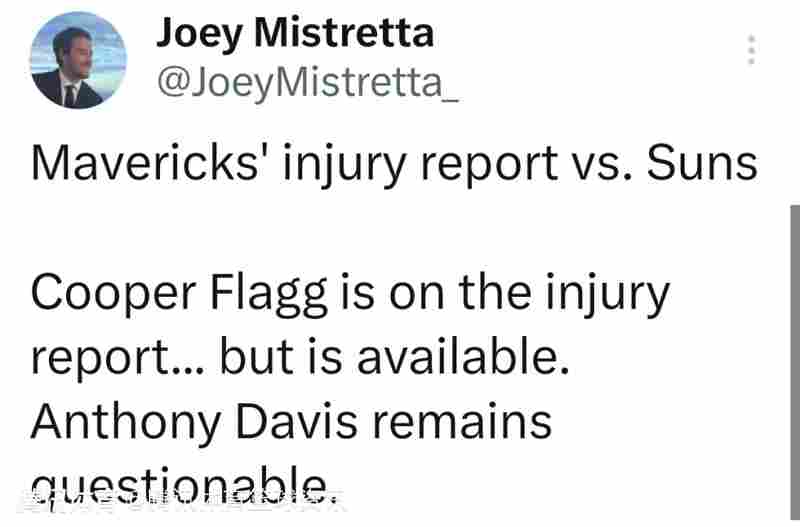 北京时间11月12日,NBA常规赛继续进行,独行侠明日将对阵太阳。赛前,独行侠方面公布了球队本场最新伤情报告。