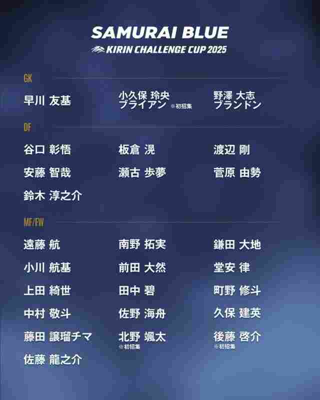 门将:1-早川友基(鹿岛鹿角)、12-小久保玲央-布莱恩(圣图尔登,首次入选)、23-野泽大志-布兰登(安特卫普)