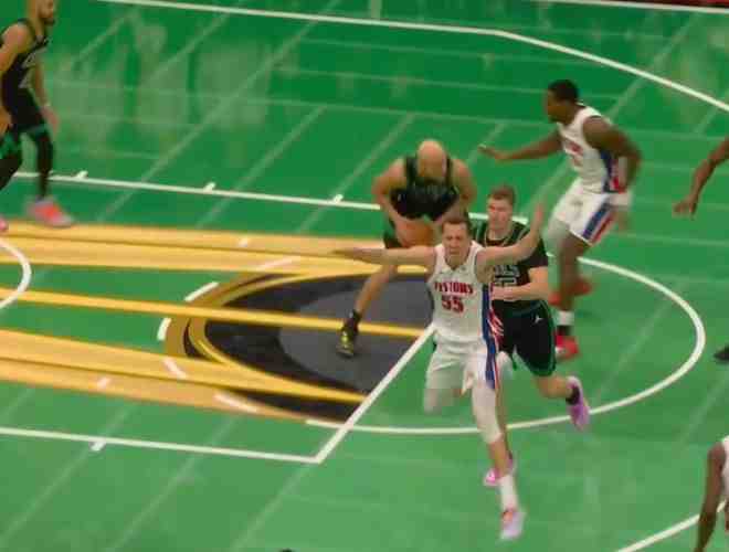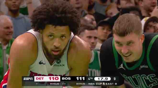 第四节决战,杰伦-布朗持球突破冲框,过人甩开防守双手暴扣完成终结,随后突破再挂着杜伦强攻上篮打成关键2+1,凯尔特人反超1分。坎宁安最后一攻遭怀特破坏出界失误,最终,凯尔特人117-114大爆冷惊险击败活塞队,终结后者13连胜。