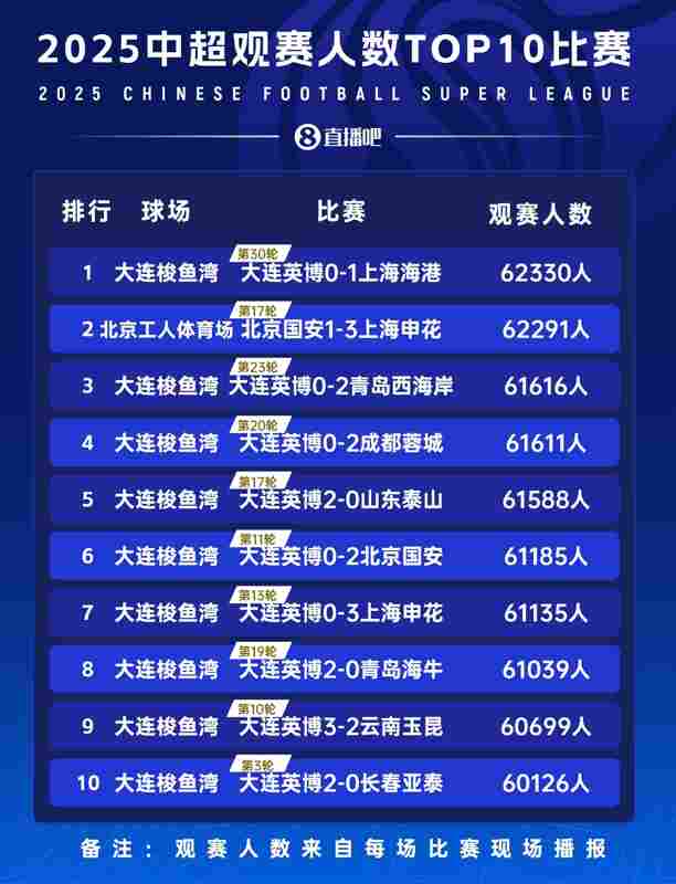数据看中超|2025中超观赛人数10大比赛,大连英博独占9席遥遥领跑 2025-11-25 03:38:07