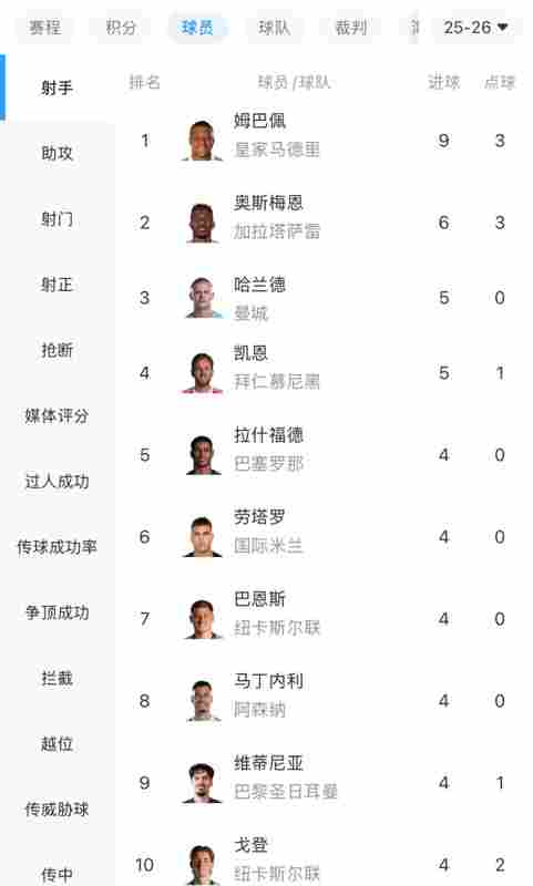 欧冠射手榜:姆巴佩9球领跑,奥斯梅恩6球第二,哈兰德、凯恩5球 2025-11-28 03:48:44