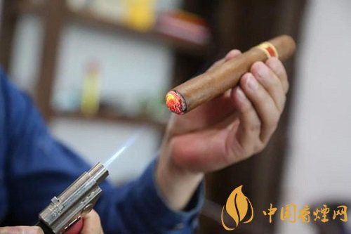 单手45°持茄,火焰正对雪茄端面,尽量靠近但不触碰,转动雪茄,到端部变黑即可停止,过分点燃会导致雪茄苦涩。