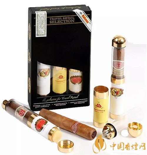 这是2008年推出的一个版本,是旅游零售系列的第三个版本,里面包含了好友、蒙特、罗密欧与朱丽叶三个品牌的三支雪茄,每支雪茄都放在一个独立的保湿管里面。