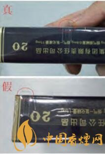 真品卷烟的拉带设计在烟包中部,开启口在烟包侧面,平头圆角;假冒伪劣产品拉线头依然在烟包上侧。