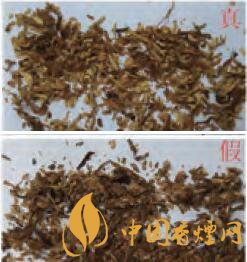 真品卷烟烟丝呈金黄色,烟丝弹性好,具有特殊气味。假冒伪劣产品烟丝多为褐黄色,烟丝含末量大,且添加大量化学香料,味道刺鼻,存在明显差异。
