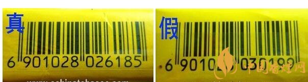 真品小盒条形码字体和条形码边缘均为明显的锯齿状,字体较细小;假烟则无真品特征,而且字体较粗。