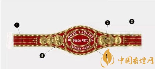 3. 白色字样:之前的茄标上曾印有这样一句话:“Rodriguez, Argüelles y Cia”,但现在的茄标上则印有品牌名ROMEO Y JULIETA、品牌创立年份Desde 1875和产地HABANA·CUBA。