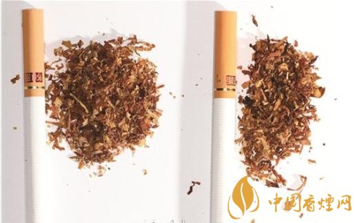 真烟烟丝切丝宽度与长度适中均匀,顔色呈橘黄色,光泽油润性好,柔软疏松,烟丝中含碎末少,烟丝结构为叶丝、膨胀梗丝和造纸法再造烟叶;假烟制丝工艺粗糙,一般使用未经处理的劣质烟丝,色泽发暗无光泽,呈暗褐色,烟丝中含碎末较多,烟丝结构一般为叶丝和没有经过膨胀处理的梗丝,无造纸法再造烟叶,烟丝结构与真品特征存在明显差异。