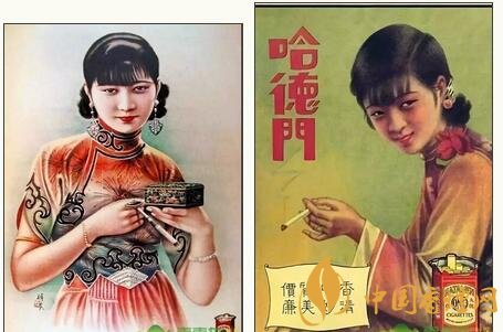 民国时期的香烟广告,“美女”成为广告画中的绝对主角,使得广告散发出诱人的女性魅力,以迎合和吸引大众的注意力。而在当时红极一时的哈德门香烟,全国各大中城市的巨幅广告牌比比皆是,触目可及。为了促销增收,除大张旗鼓地推出各类广告外,还在每盒烟中配有画片一枚,供欣赏收藏。画面皆为摩登美女,印刷精美,色彩靓丽。画片背面亦印有广告词“哈德门香烟人人爱吸”。据查,美女共有百名,这些活泼自信,烫发,穿高跟鞋,旗袍高开叉的“香烟美女”,服饰发型和神态各有千秋,情态纷呈,不管是读书、梳妆,还是玩乐,无一不让人感受到美感带来的视觉冲击。一枚拥有,即思百枚。