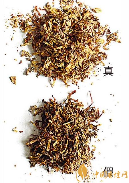 真品卷烟烟丝采用复烤工艺,无烟梗等杂质,色泽淡黄、光洁油润;假冒卷烟烟丝粗制滥造,杂质较多,色泽暗淡、气味刺鼻。
