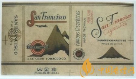 上世纪三十年代,由利群烟厂出品的“旧金山”牌卷烟,为横版。烟标上由红色大写英文字母“S”带出的“San Francisco”品名,舞动感十足。其下两座金山上,一架飞机翔过,山脚旁画有三个重叠的红色圆圈,一圈一圈又一圈,像极了烟蒂的火苗生生不息,在此中间写有“CIGARETTES”,别出心裁地交代了“旧金山”牌卷烟的品质和规格。副版的文字多于图案,草写的英文烟标,重复竖写横写的“Famous cigarette”,左上角“注意封口、谨防假冒”八个中文字的提示,却很醒目。当时的烟标设计,以提示的文字显现,确不多见。整张烟标几乎铺满了“旧金山”牌卷烟所要表达的内容。
